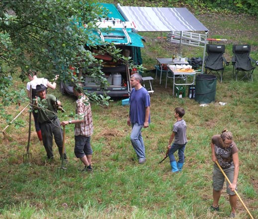 Biotop-Aktion am Burgstall. Auf der zweitobersten Terrasse finden wir einen Bau, der wahrscheinlich von einem Marder gebaut wurde. Manfred meint: "Zu klein für einen Fuchs" ... mehr über unseren → Steinmarder im Glemstal → NABU Grundstück Burgstall |