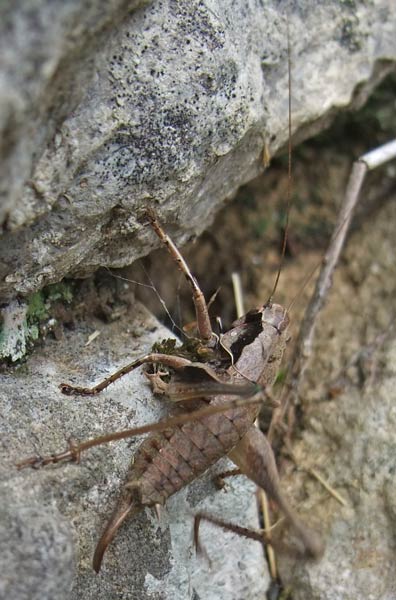 Biotop-Aktion am Burgstall: Sehr viele Kurzfühlerschrecken waren auf den Terrassen und diese weibliche Langfühlerschrecke mit Legesäbel: Strauchschrecke (Pholidoptera griseoaptera) ... mehr über unsere → Langfühlerschrecken im Glemstal → NABU Grundstück Burgstall |