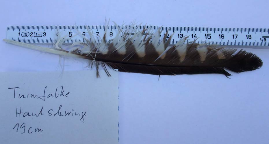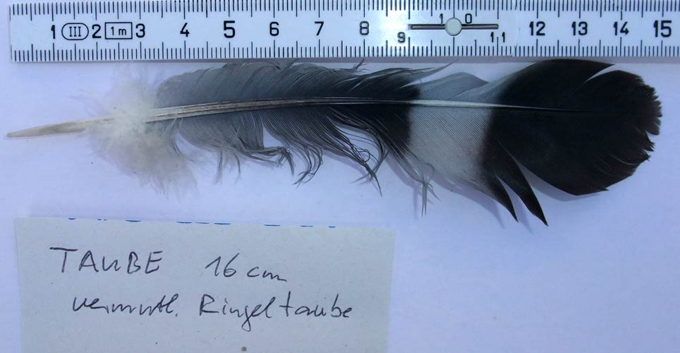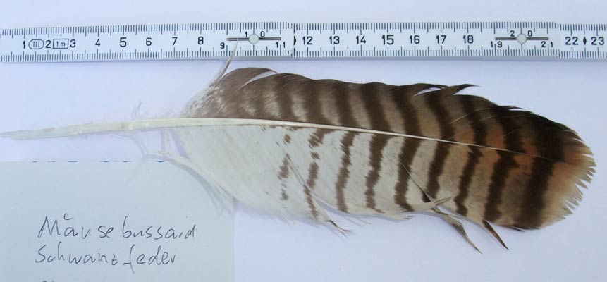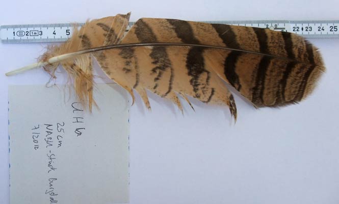 Die Feder ist 24,5 cm lang. Jochen Völlm und Ann-Marie Ackermann haben diese Feder als Feder eines Uhus (!) und zwar aus der Armschwinge, bestimmt. Für eine Schwanzfeder sei die Spitze zu weich, meinte Jochen Völlm. Norbert Baasner kommentiert am 31.8.2012: "Da war ich zunächst sehr skeptisch, dachte an Waldohreule, aber Größe, Muster... Eindeutig Uhu, rechte Handschwinge." Ein sensationeller Fund. Denn mir sind keine Uhus im Glemstal bekannt, seit die Uhus aus dem Steinbruch Zimmermann verschwunden sind. Der Kiel ist intakt. Daher wohl ein normaler Verlust einer Feder. ... mehr über unsere → Eulen im Glemstal |