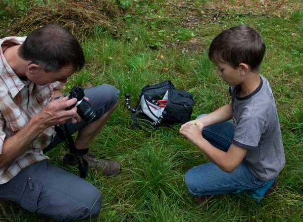 Biotop-Aktion am Burgstall: Lino Trinkmann hat eine kleine Kröte entdeckt und zeigt sie Markus Hansen ... mehr über unsere → Erdkröte im Glemstal → NABU Grundstück Burgstall |