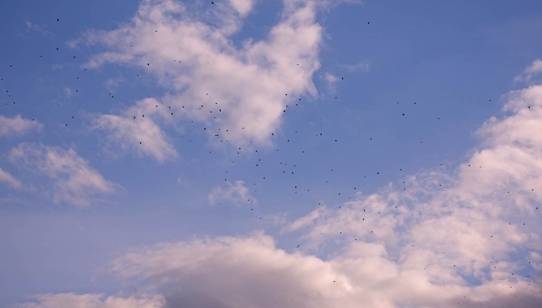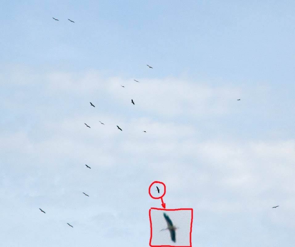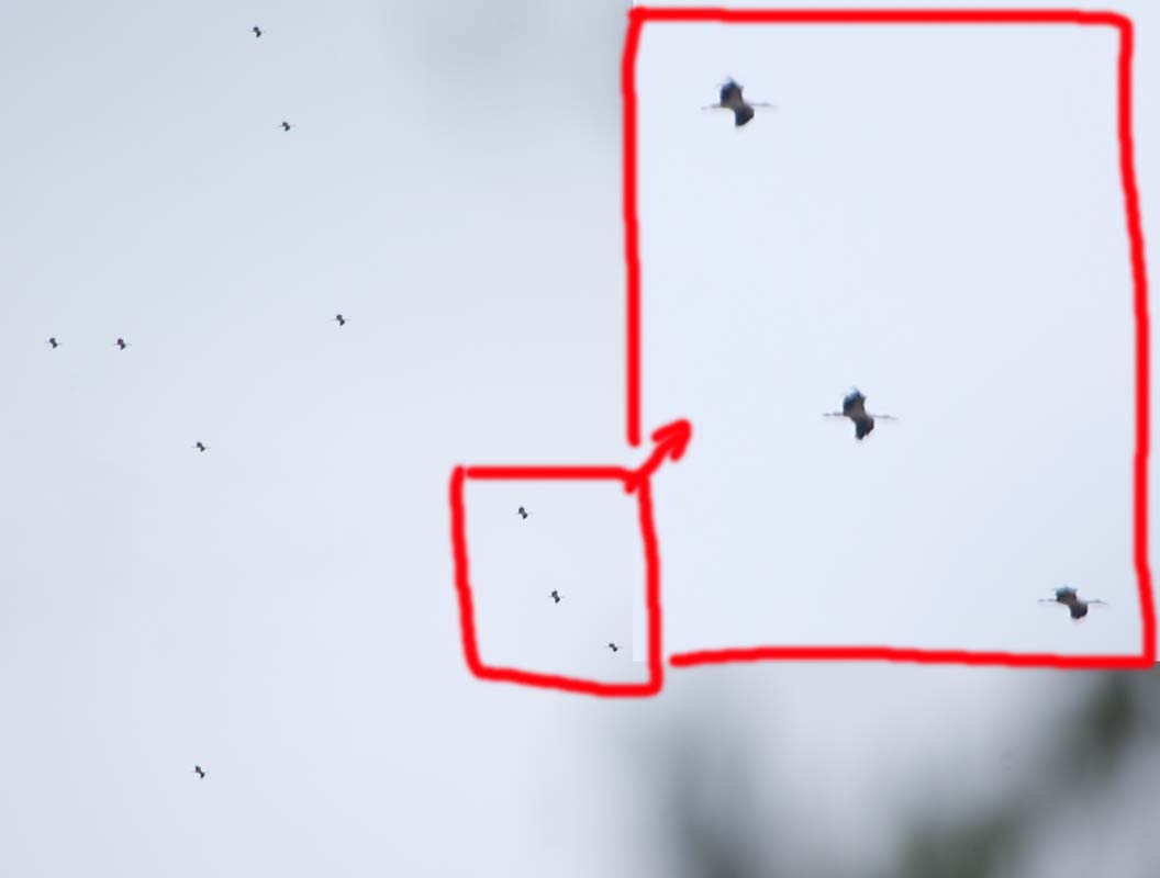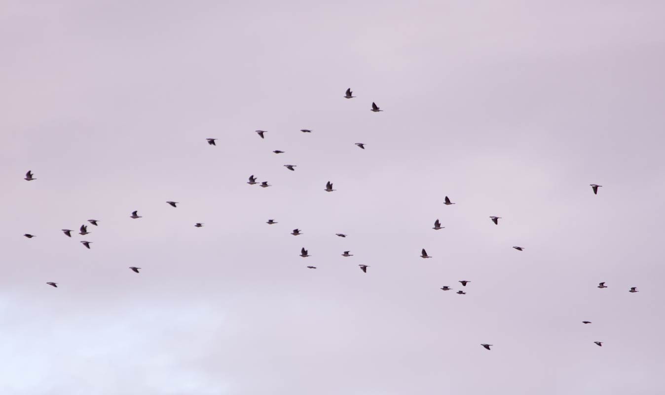 Süden) Auf dem Foto zähle ich 150 Vögel. Ich meine die saßen auf dem Acker und flogen dann truppweise hoch und bildeten diesen Riesen-Trupp. Haben sich dann wieder gesetzt. |
