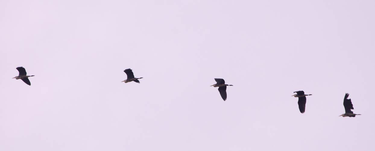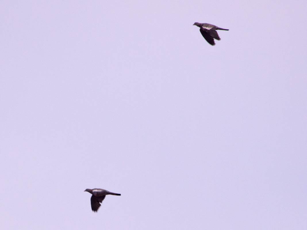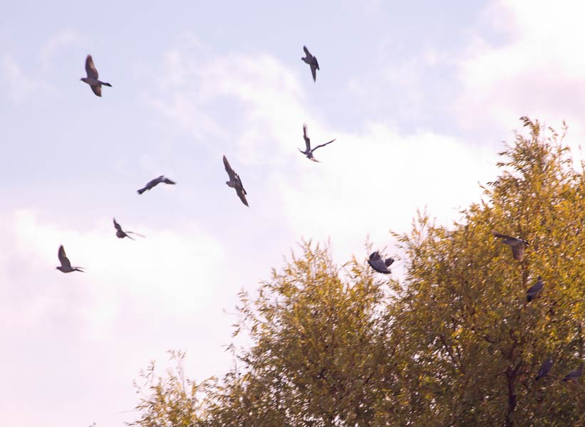 ein Trupp Ringeltauben zieht nach Südwest. Hinten unten sind auch Hohltauben im Trupp