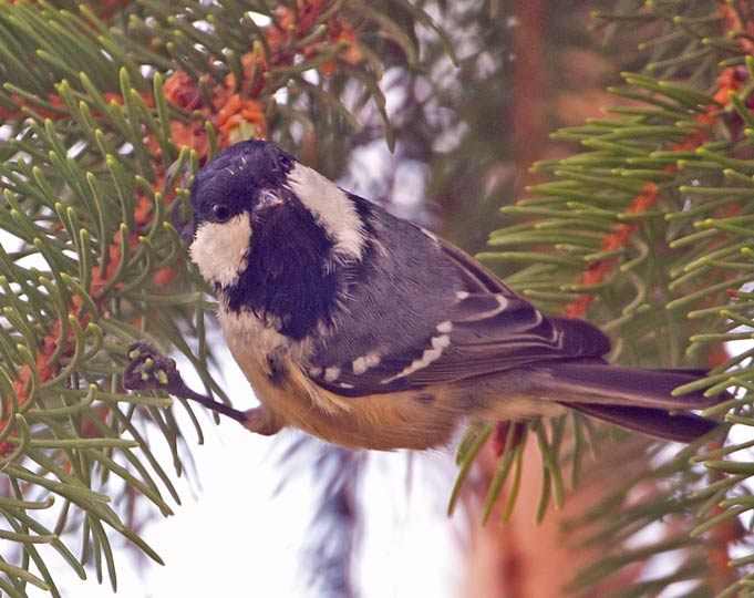die Tannenmeise hält sich an den dünnen Nadeln (!) fest