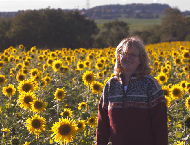Sonnenblumenfeld an der Katharinenlinde. Alle Blumen schauen nach Osten. Die