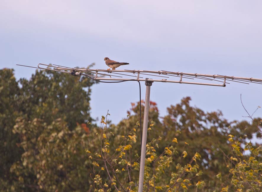 Ein Turmfalke nutzt die Steinkauzortungsantenne an der Katharinenlinde als
