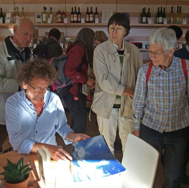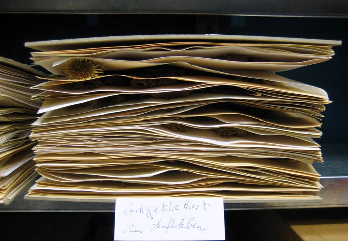 Der Besuch der alten Herbare im Keller des Museums war für die Mitglieder eine Überraschung: so hatten sie sich das nicht vorgesellt. Normalerweise ist dieser Bereich nicht für die Öffentlichkeit zugänglich. Hier liegen viele tausend Blätter mit Pflanzen aus Baden-Württemberg, aber auch z. B. von der Kamtschatka-Expedition 1720 in einer Sammlung. Eine Sammlung war in wunderschöne bunte Mappen eingelegt, jede Mappe mit einem Bibelspruch entweder in Latein, hebräisch oder deutsch beschriftet. Das war optisch schon ein sehr schöner Anblick. Wir erfuhren, wie man ein Herbar anlegt, wie die speziellen Papiere und Aufklebestreifen sein müssen. Herr Dr. Wörz beantwortete wirklich alle Fragen ausführlich und zu unserer großen Zufriedenheit.