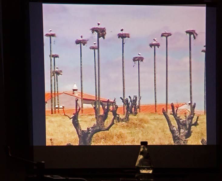 | Prof. Dr. Claus König war in den letzten 50 Jahren schon über 30 mal in der Extremadura | Viele Gäste sind gekommen | Dieses surreale Foto aus dem Video hat mich besonders beeindruckt: Ersatznester für Störche. |