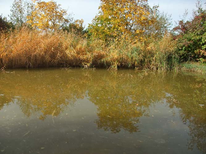 Teich ist braun und ganz trüb. Vermutlich Gülleeintrag. Schilfrand ist