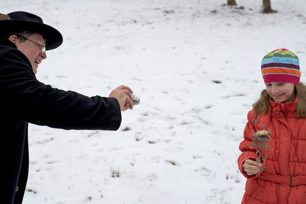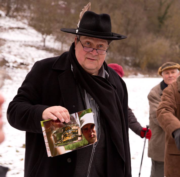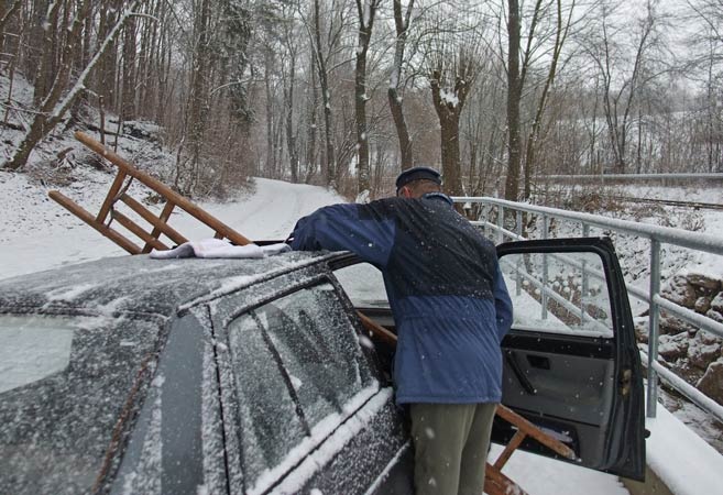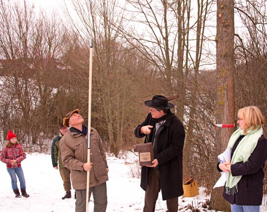 Günter Krämer im Räuschelbachtal. Bei Schneetreiben bereiten wir die Gedenkfeier am Helmut-Theurer-Baum vor