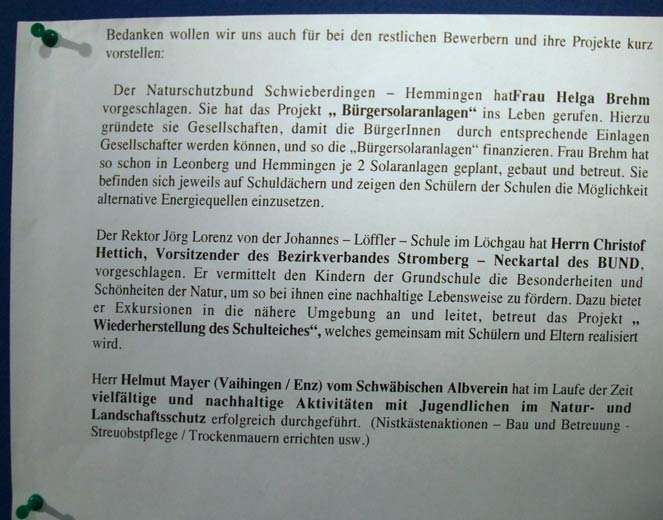 Rotraut Völlm hat ermittelt, dass der Helmut-Theurer-Baum 1993 zu Ehren von Helmut Theurer gepflanzt wurde. Nach 20 Jahren als 1. Vorsitzender des DBV (heute NABU). Rotraut hatte die Idee eine Wanderung "auf den Spuren Helmut Theurers" im Räuschelbachtal anzubieten. |