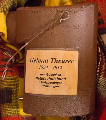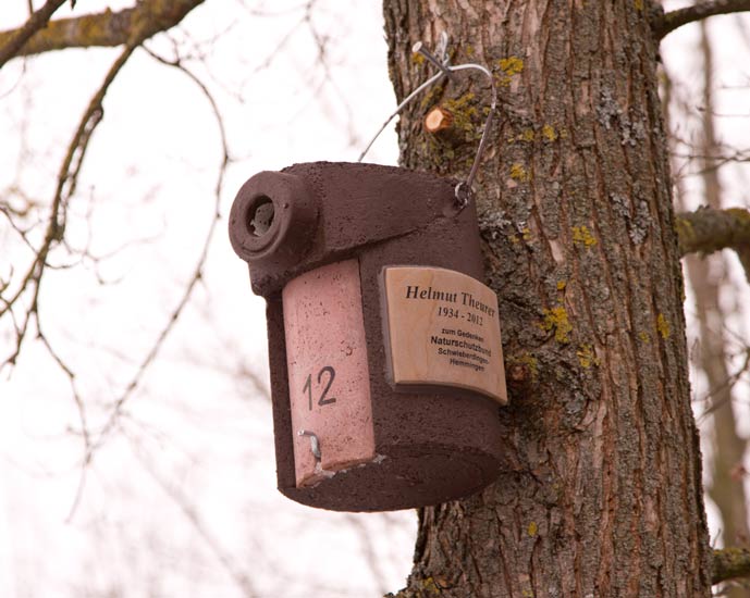 Gedenknistkasten zu Ehren von Helmut Theurer. Ildiko Preuse hatte diese schöne Idee. Das Münchinger Tal war das persönliche Nistkastengebiet von Helmut Theurer. Günter Krämer hat beim Steinmetz Hr. Stein diese schöne Platte machen lassen. |