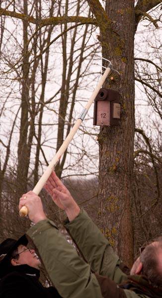Ralf Trinkmann hat das Werkzeug zum Nistkasten-Aufhängen. Der Wendehals steht in Deutschland auf der roten Liste und findet mangels alter Bäume mit Löchern kaum noch Brutmöglichkeiten. Wir wollen ihm mit dem Nistkasten helfen. |