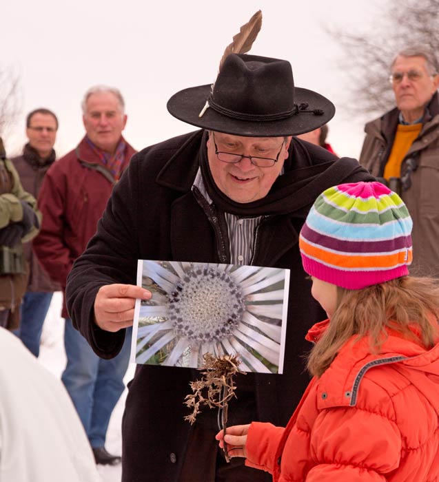 Thomas Gölzer bestaunt, wieso das Foto der blühenden Silberdistel und die verblühte Silberdistel (Carlina acaulis) von Amelie dieselbe Blüte sein können |