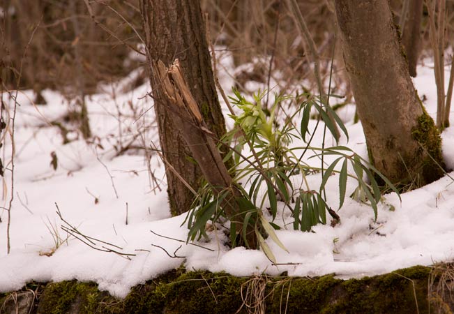 welch eine Lebenskraft! ein Frühblüher hat trotz wochenlangem Schnee und Frost sich herausgekämpft durch den Schnee und begonnen zu blühen: Unsere stinkende Nieswurz (Helleborus foetidus), ein Hahnenfussgewächs ... mehr über unsere → Hahnenfussgewächse im Glemstal |