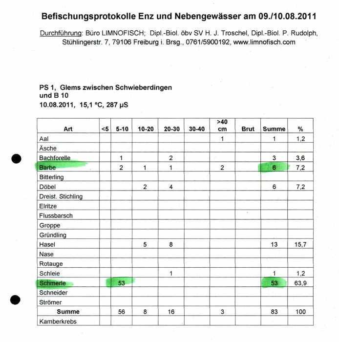 Befischungsprotokoll der Glems: Danke an den Sportfischerverein für die Überlassung des Protokolls.