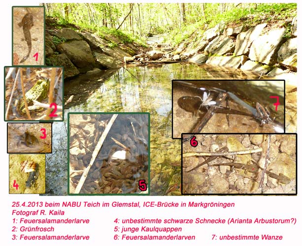 Martin Wunner schreibt mir am 22.4.2013: "Am 16.4.13 beim Spazieren am Räuschelbach im Münchinger Tal zwischen Schwieberdingen und Münchingen entdeckte ich sehr viele Feuersalamanderlarven. Der Bach war durch Trockenheit zurückgegangen und im Flussbett an tiefen Stellen mit etwas Restfeuchtigkeit befanden sich die vielen Feuersalamanderlarven, die aussahen als wären sie am Austrocknen. Inzwischen hat es wieder geregnet, doch wenn es wieder wärmer und der Fluss trockener wird denke ich, dass die jungen Larven kaum eine Chance haben. Den ganzen Fluss entlang sind viele sehr junge, kleine Larven zu beobachten. Ich bin sehr fasziniert von den Tieren und würde gerne helfen, falls dies möglich ist."