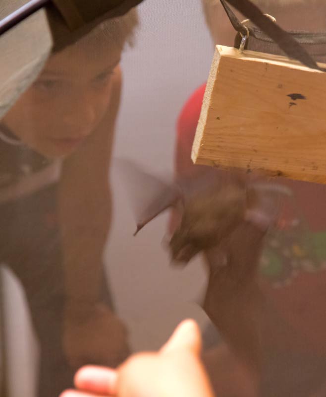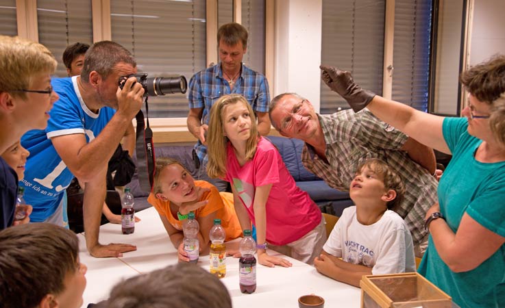 einige haben sich getraut, in einen Topf voller lebender Mehlwürmer zu greifen | Die Abendsegler-Fledermaus wird mit Mehlwürmern gefüttert |