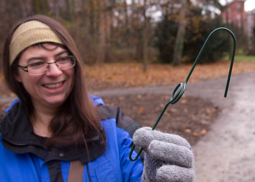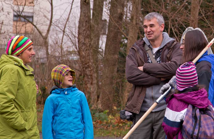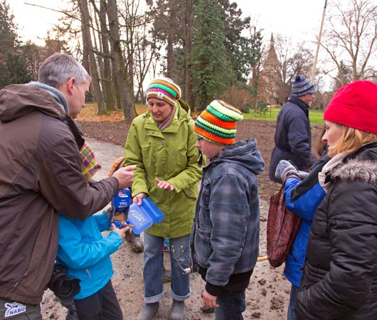 Nicki Mietzker (Mitte) bastelt solche Vogelfutterstellen aus Tetrapack-Packungen | Kerstin Cotrus zeigt eine Aufhängung für Vogelfutter. Wolfram Bock hatte 28 dieser Aufhängungen gebastelt. | Gute Stimmung trotz heute fürchterlichem Wetter. Wenn es etwas kälter gewesen wäre, dann hätte es geschneit. |