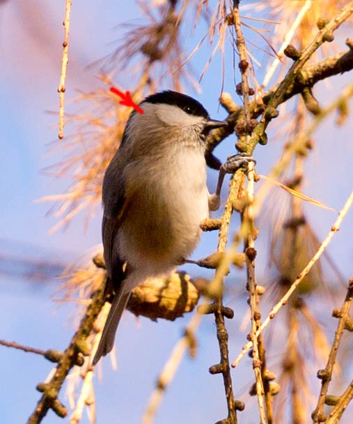 Zeilwald. Der rote Strich zeigt die Unterscheidung zur Weidenmeise. Dort wäre das ganze Wangenfeld weiß.