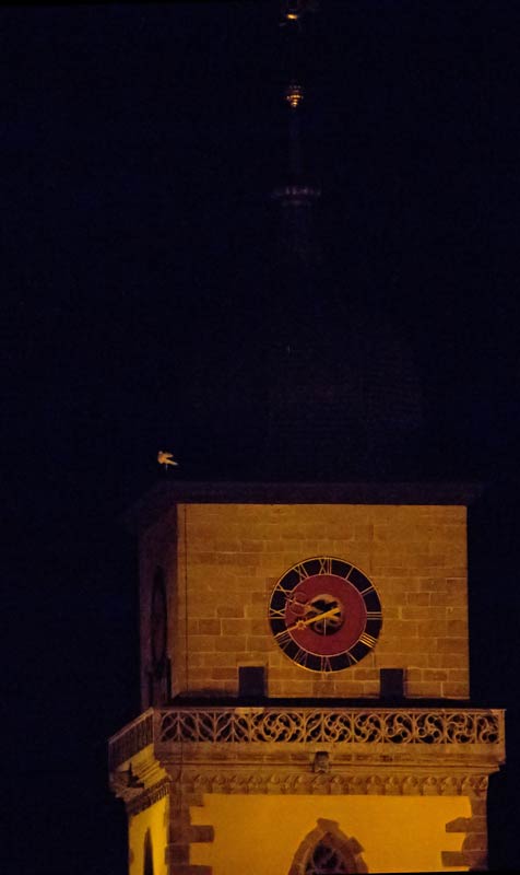 Storch auf dem Turm der Georgskirche. Um 7:20 morgens ist er exakt Richtung Osten abgeflogen. (Und offenbar wenig später wieder zurückgekommen, denn um 9:00 war er wieder da auf dem Chordach der Georgskirche) |