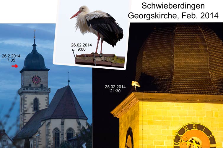der Storch um 7:05 (kurz nach dem Hellwerden) auf dem Turm der Georgskirche in Schwieberdingen ...mehr über die → Georgskirche in Schwieberdingen |