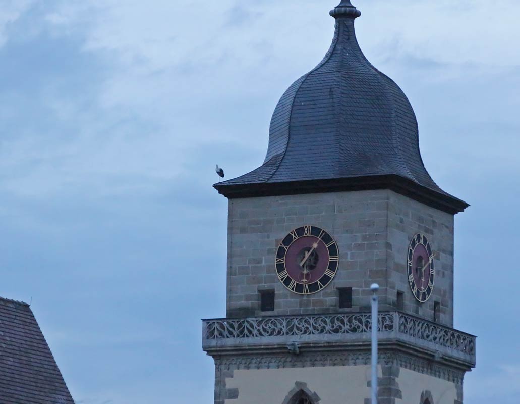ein Storch um 9:00 auf dem Chor der Georgskirche