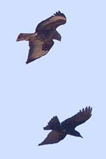 Mäusebussard im Luftkampf mit einem unbestimmten krähenartigen Vogel |