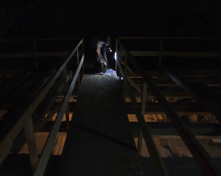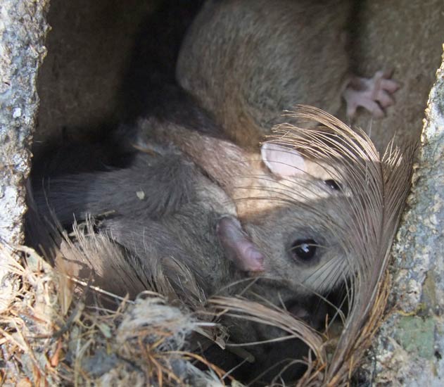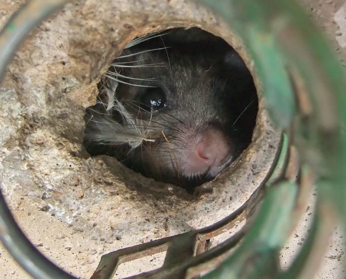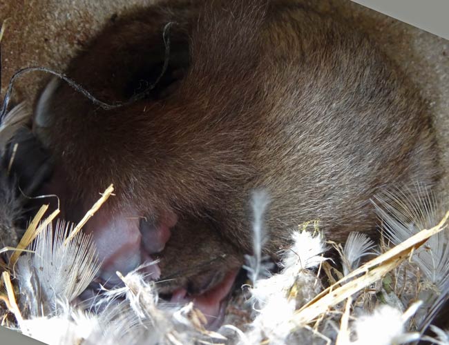 Unsere NABU-Siebenschläfer-Familie auf dem NABU-Stückle Markt: Ein Schwanz eines Jungtieres hängt aus dem Loch
