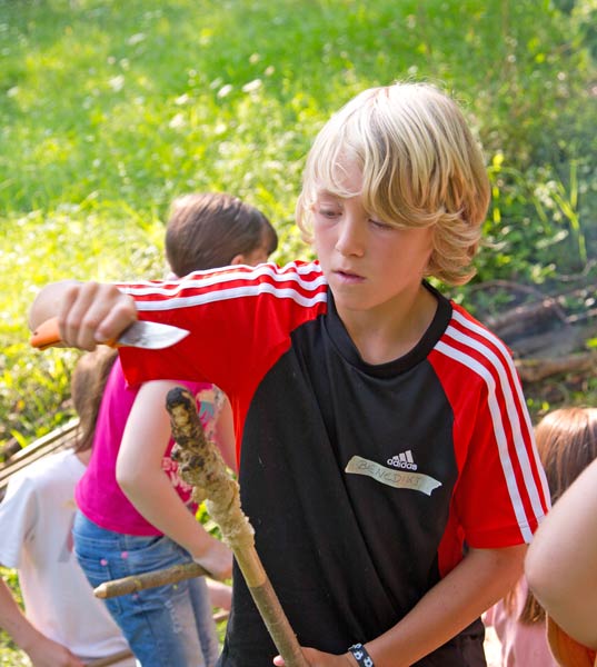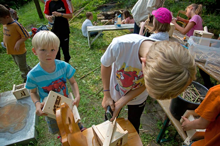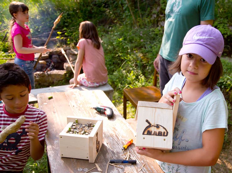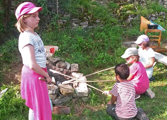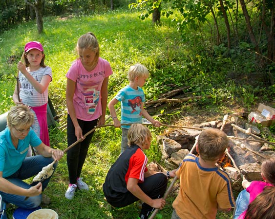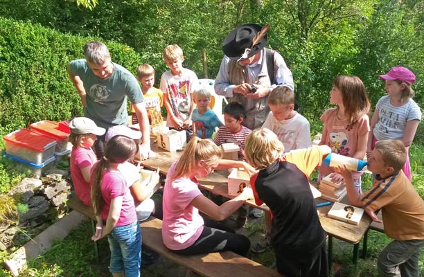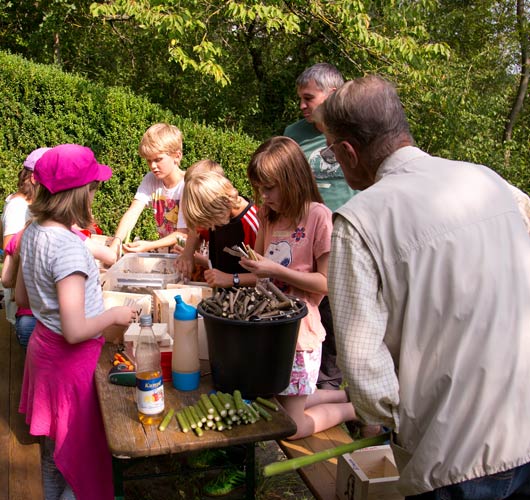 Laura zeigt ihr fertiges Bienenhotel. Kasimir testet sein Stockbrot |