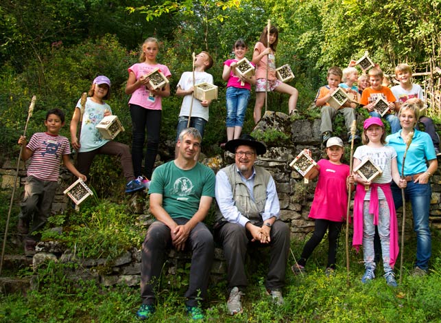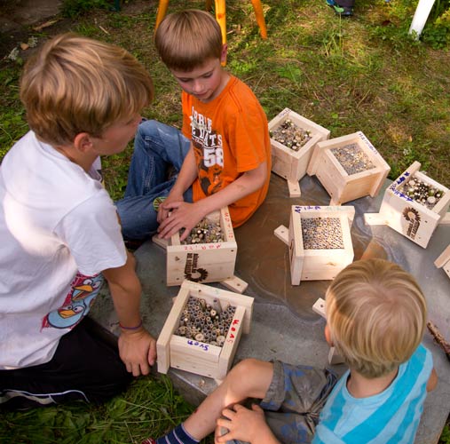Mika, Moritz und Sven betrachten die fertigen Bienenhotels. Unsere Wildbienen