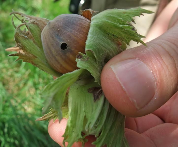 Derartige Löcher in Haselnüssen kommen vom Haselnussbohrer (Curculio