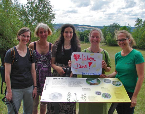 | Gruppenbild der BUND-Gruppe Ulm-Mitte (von links nach rechts: Katrin Voss-Lubert, Anke Zeppenfeld, Miriam Piehler, Henrike Hampe, Monika Riepl) | Der Standort der Lehrtafel bei der Wilhelmsburg am Fort Oberer Kuhberg |