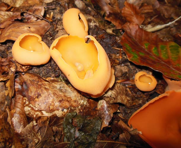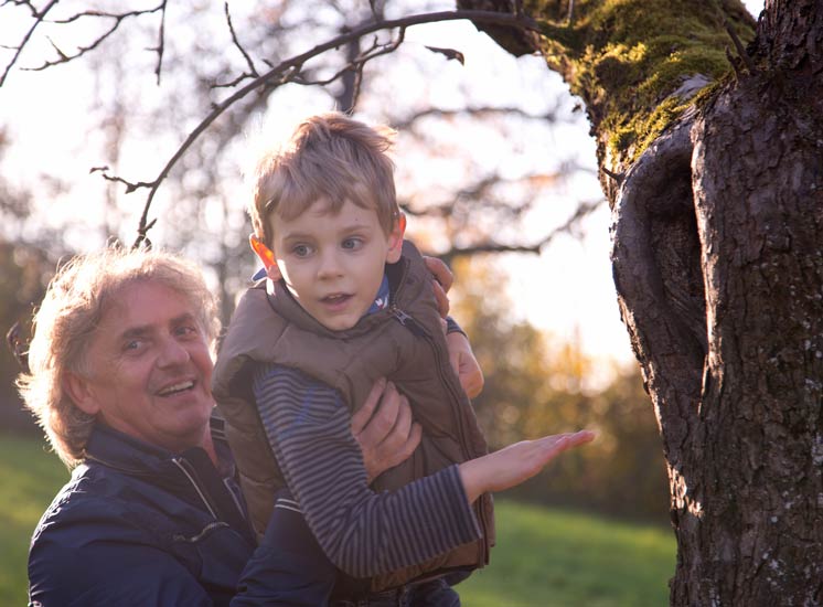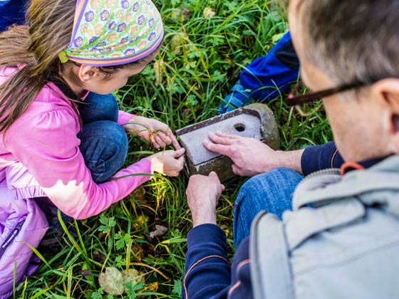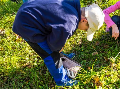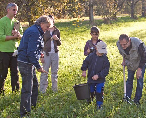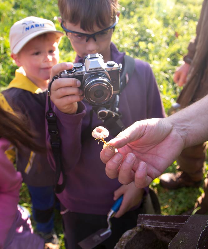 Ein Pilz aus einem Nistkasten wird von Lino fotografiert. Manfred meint