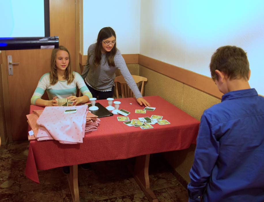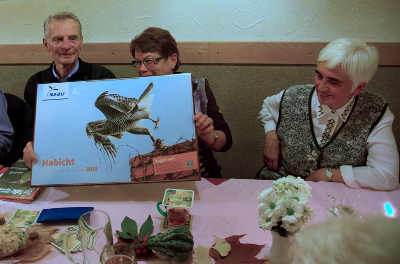 Günter Krämer links zeigt den Vogel des Jahres 2015, den Habicht. Lisa Krämer hat die schöne Tischdekoration besorgt, eine Spende vom Hofladen Glaser. |