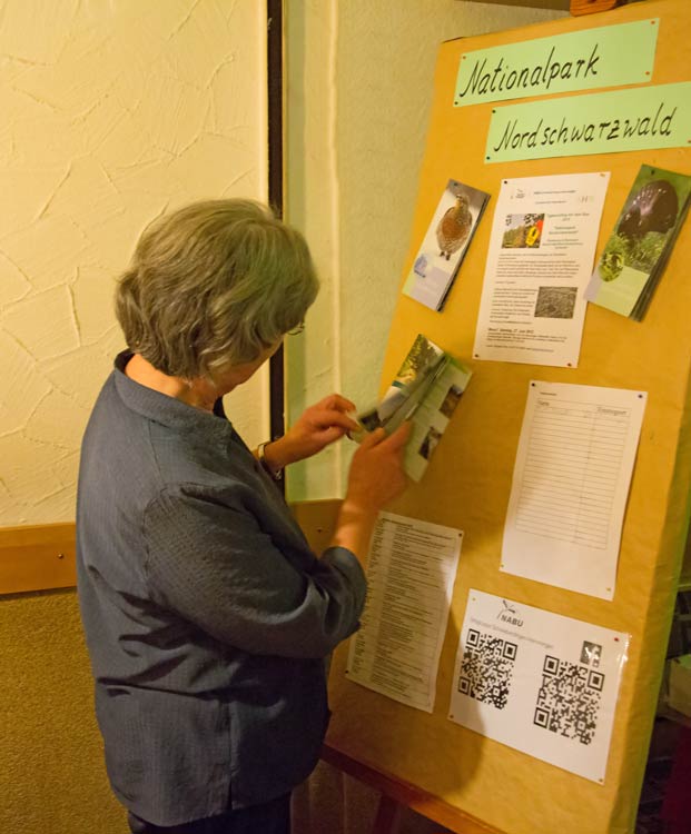 Barbara Wild betrachtet unseren Entwurf vom NABU Programm 2015 mit Busausflug in den Nationalpark Nordschwarzwald |