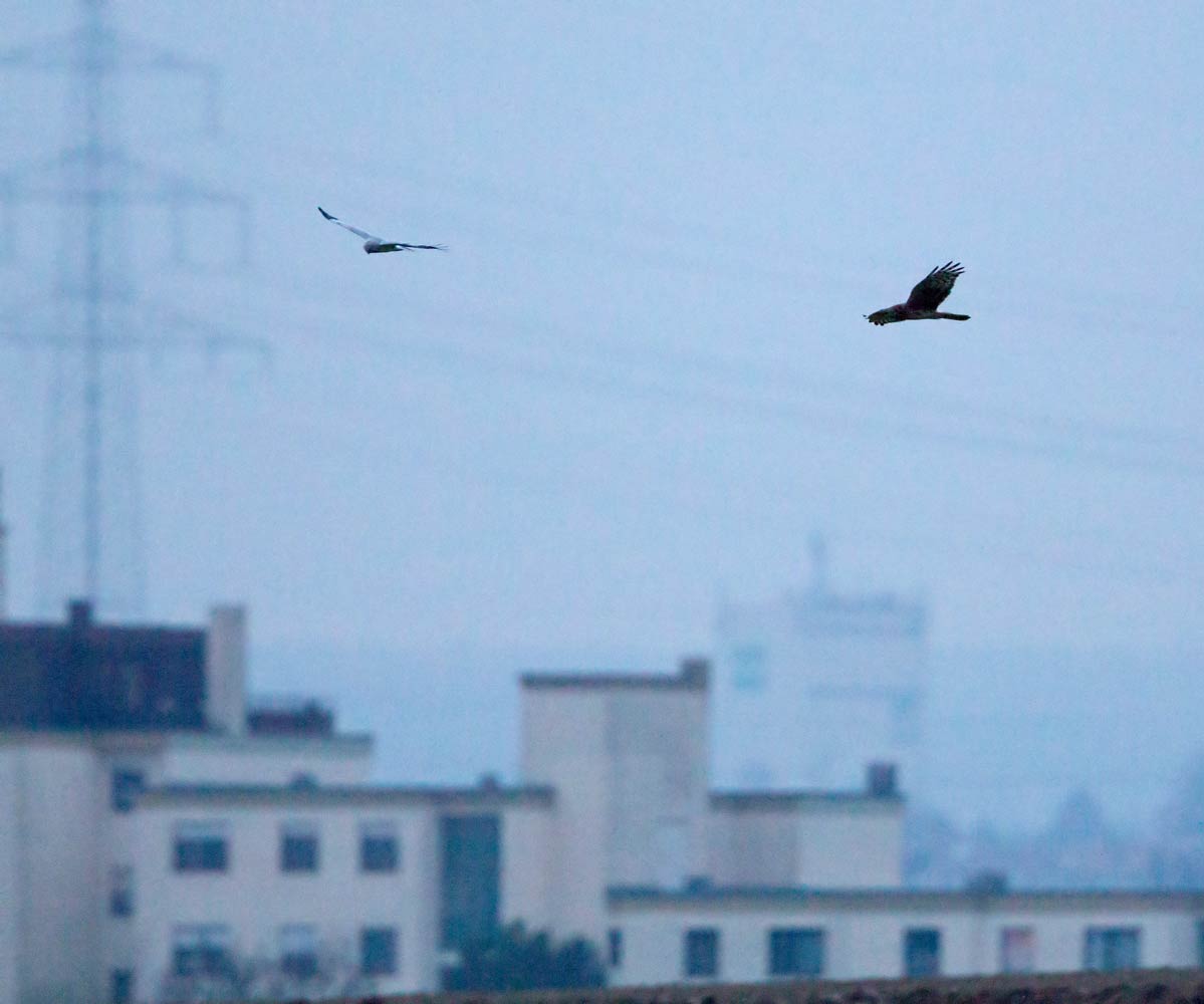 links ausgewachsene Kornweihe rechts junge Kornweihe vor der Skyline von Hemmingen