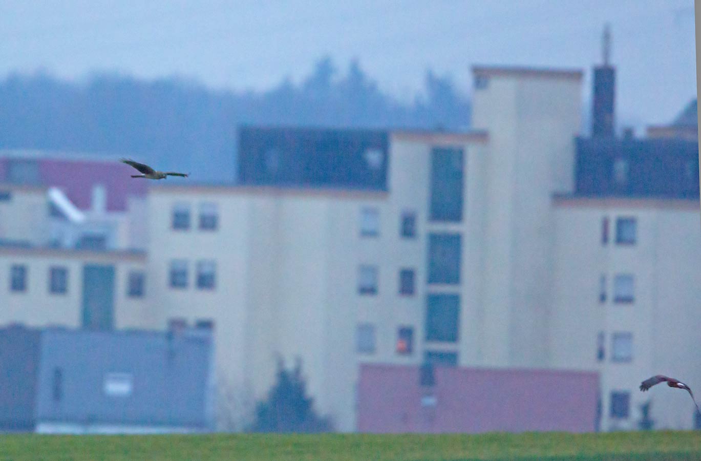 zwei junge Kornweihen vor der Skyline von Hemmingen ... mehr über Sichtungen der → Kornweihe im Glemstal |