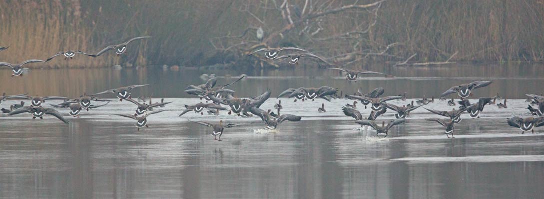 in den See. Am schwarzen Schnabelansatz als Saatgänse zu erkennen |