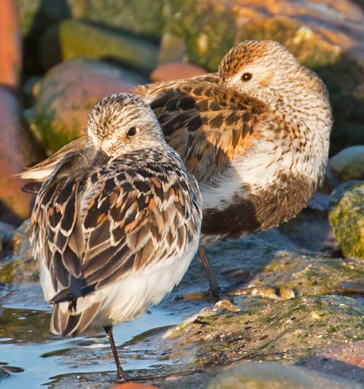 links Sanderling rechts Alpenstrandläufer