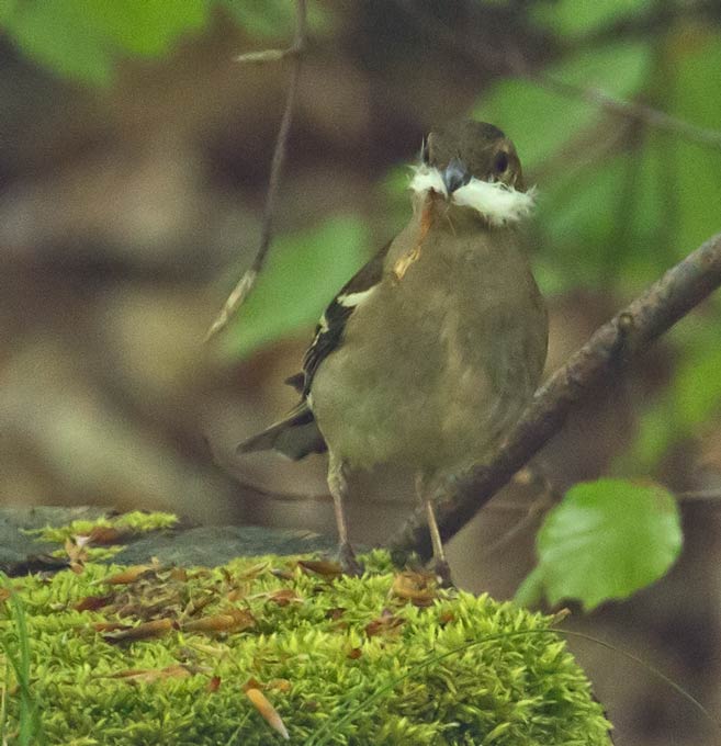 Buchfink mit Nistmaterial ... mehr über den → Buchfink im Glemstal → Glemswald an der Glemsquelle |