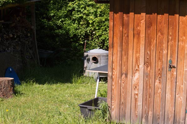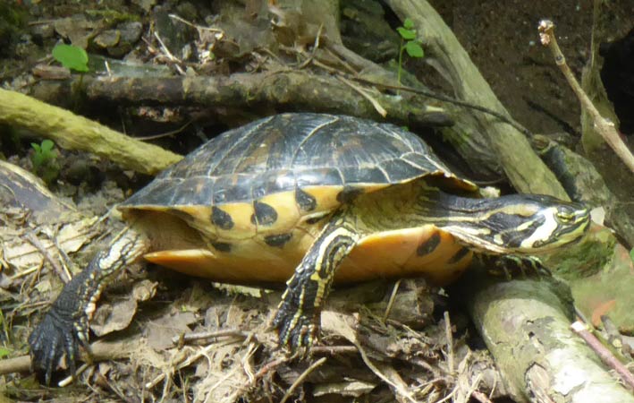 Schildkröte am großen Kessel. Eine nordamerikanische Gelbwangen-Schmuckschildkröte. (Trachemys scripta scripta) mehr über → Reptilien im Glemstal |