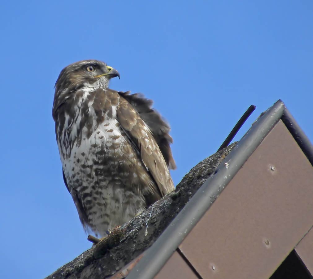 ein Mäusebussard auf einem Hausdach in der Gartenstrasse