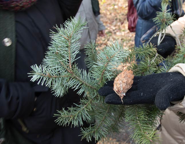 NABU Gruppe an einer kleinen Fichte mit Fichtengallen |
