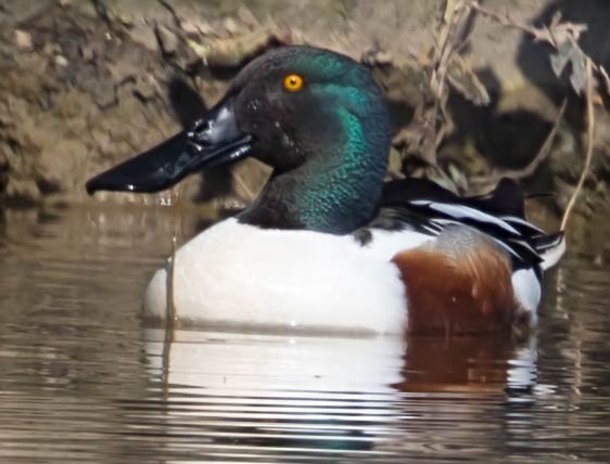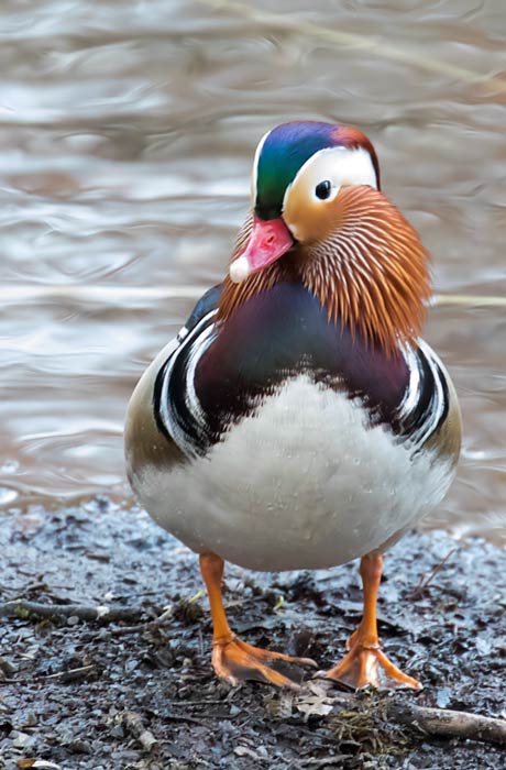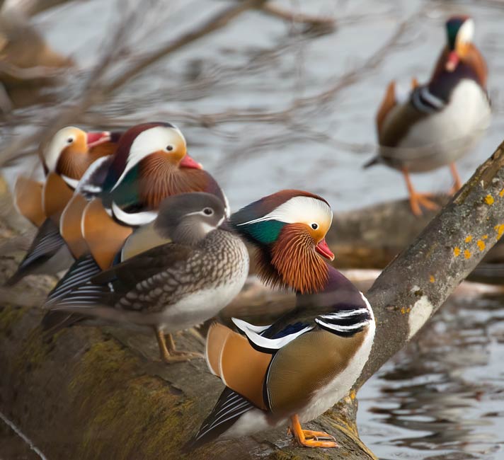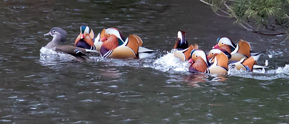Der Mandarinentenerpel vorne plustert sich sehr auf ... mehr über die → Mandarinente im Glemstal |