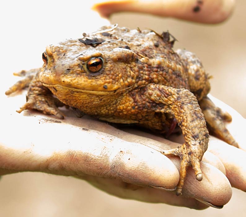 Erdkröte auf der Hand einer NABU Helferin. Wegen der Erdkröten gibt es den