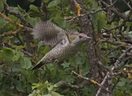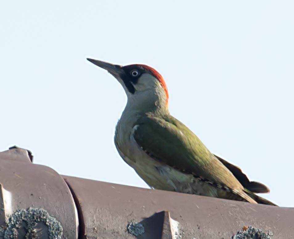 weibl. Grünspecht sitzt auf dem Nachbarhaus