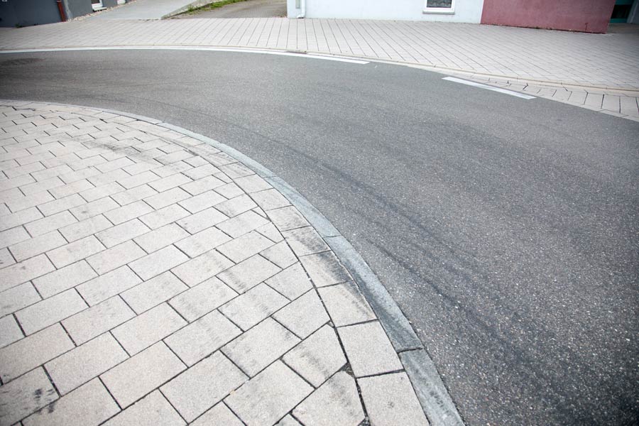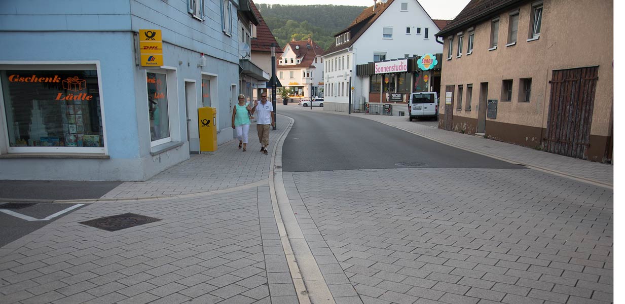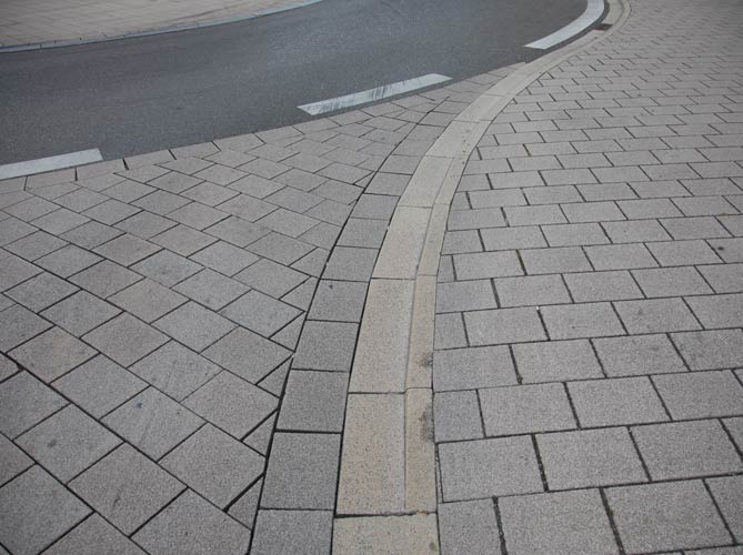 Verkehrsberuhigung. Gepflastert sind Einmündungen und Kreuzungen. Als