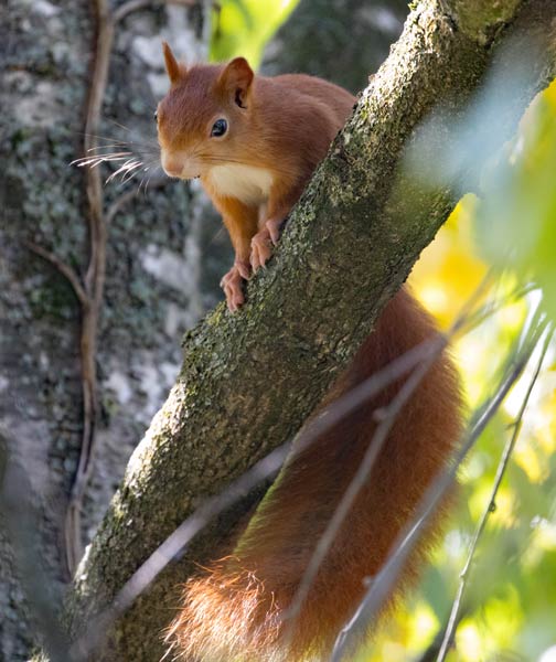 Eichhörnchen in unserem Garten auf der Birke, sammelt Nüsse