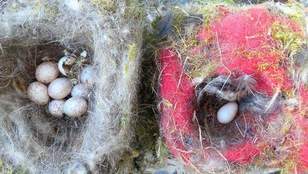 Das linke Nest enthält 8 Eier einer Kohl- oder Blaumeise.