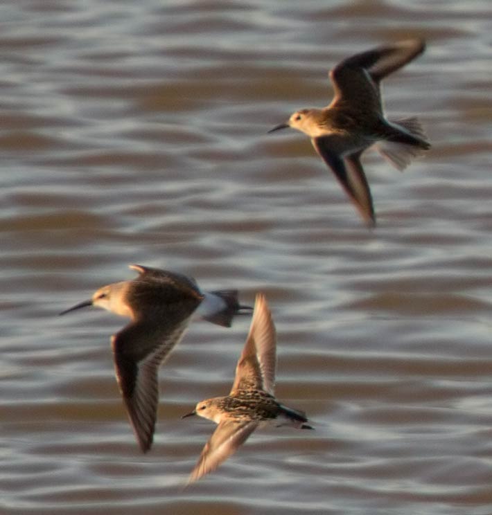 am Bürzel sieht man Unterschiede: Sichelstrandläufer und Zwergstrandläufer fliegen gemeinsam (Danke an Jochen Völlm für die Artbestimmung) |